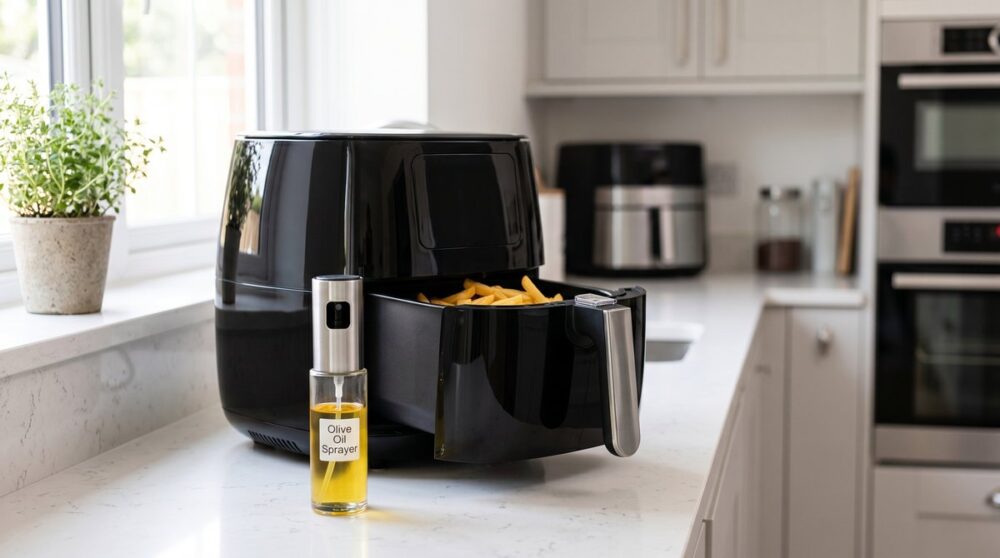 氣炸鍋的溫度通常設定在 180-200°C,所以用油的煙點最好在 200°C 以上。葡萄籽油、芥花油、酪梨油都是不錯的選擇。噴霧式油罐搭配這幾種油使用起來特別方便,而且不容易堵塞噴頭。